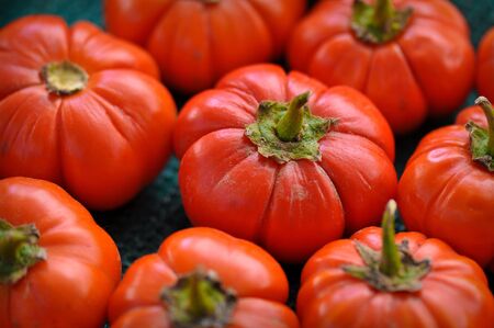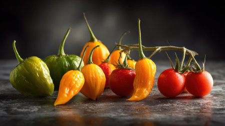 A stunning arrangement of vibrant tomatoes and peppers showcases their unique shapes and colors against a dark backdrop, highlighting their freshness and culinary potential.