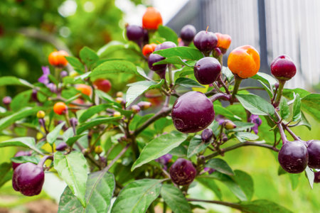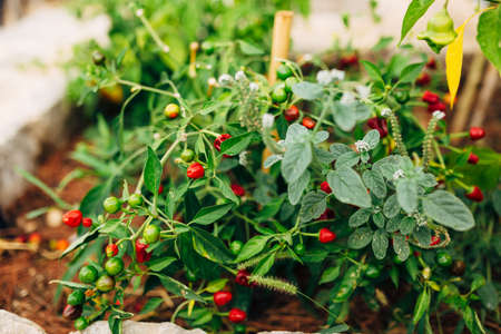 Hot peppers. Pepper plant with spherical fruits in close-up.