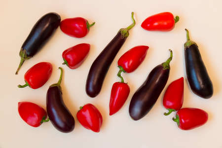 Aubergines and sweet peppers on beige background. Top view.