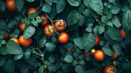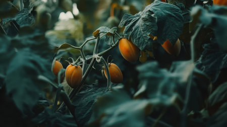 A close-up of fresh tomatoes growing on green vines, surrounded by lush foliage. The image highlights themes of gardening, agriculture, and organic produce.