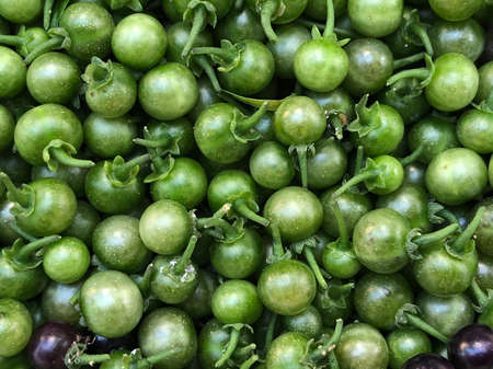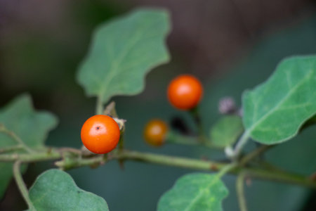 Orange berries of a plant, likely a species belonging to the Nightshade family Solanaceae. The fruit of Solanum Torvum known as Turkey Berry, Devils Fig, or Sundakkai