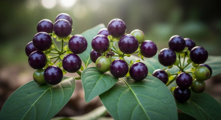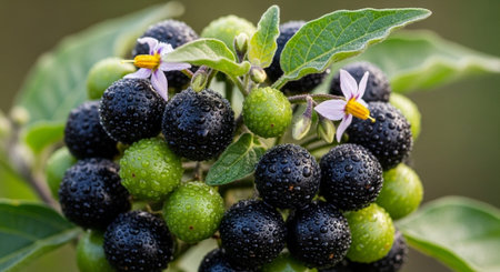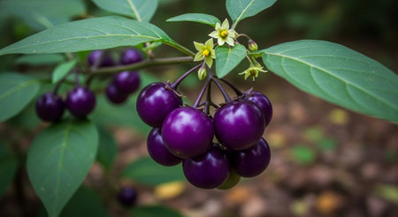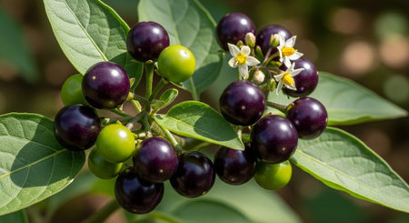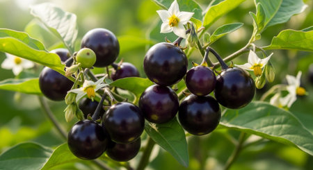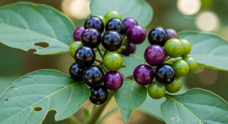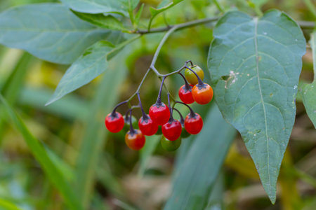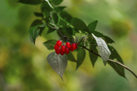 vibrant image showcasing ripe red nightshade berries against a lush green backdrop. The contrast highlights the berries' vivid color and evokes a sense of nature's hidden beauty