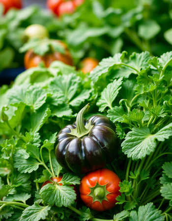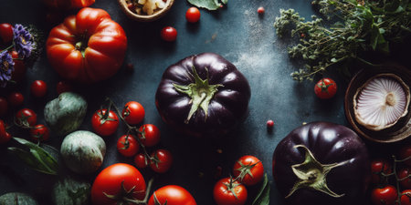 A beautiful arrangement of fresh vegetables and herbs captures the essence of healthy cooking. Lively colors highlight the rich textures of tomatoes and eggplants, perfect for culinary inspiration.