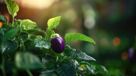 A close-up view of a fresh eggplant developing on a lush green plant with glistening water droplets, illuminated by soft sunlight in a serene garden setting.