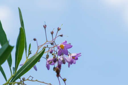 Flower solanum aviculare purple in bloom in spring. Selective focus. Copy space.