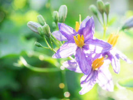 Close up of blooming purple and yellow flower of Solanum tuberosum