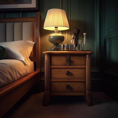 A serene nightstand scene featuring a glass of water, a lamp casting soft light, and medication, ideal for depicting a restful nighttime atmosphere.