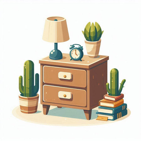 Wooden nightstand with lamp, books and plants. Vector illustration.