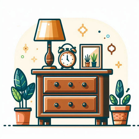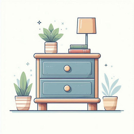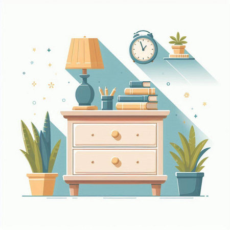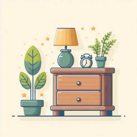 Cabinet, bedside table, lamp and plants. Vector illustration.