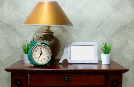 Alarm Clock and Reading Lamp on Bedside Table. Copy Past text