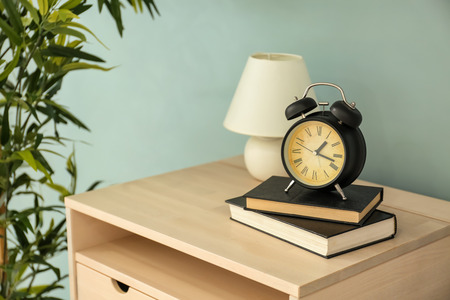 Bedside table with lamp and alarm clock. Flat style vector illustration.