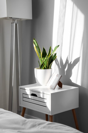 An Elegant Bedroom Featuring a Modern Nightstand and Stylish Decorative Elements Throughout