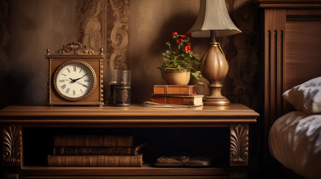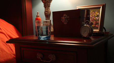 A cozy nightstand scene featuring a glass of water, a vintage clock, and a decorative box. Soft lighting enhances the serene atmosphere, making it perfect for relaxation.