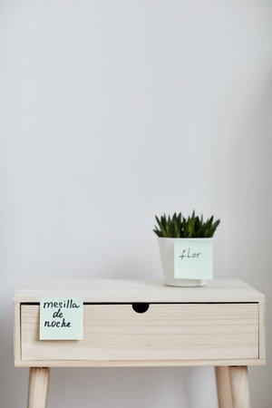 Foreign words written on notepapers stuck on small white flowerpot with green domestic plant and wooden bedside table standing by wall