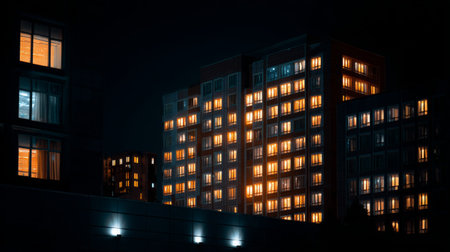 A captivating nighttime photograph showcasing urban residential buildings with illuminated windows. The glowing lights create a warm and inviting atmosphere in the cityscape.