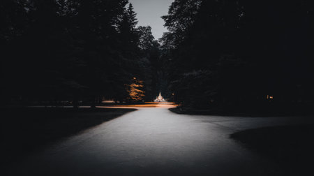 Serene winding path through tall pine trees in dark forest illuminated by bright vehicle headlights creating ethereal light trails at twilight