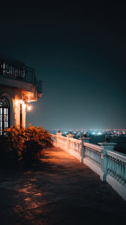 An evening image shows a balcony overlooking a city. Warm light emanates from fixtures, illuminating the walkway and architectural details. The scene showcases a contrast between the lit building elements and the dark surroundings. This picture can be used for various commercial or editorial applications.