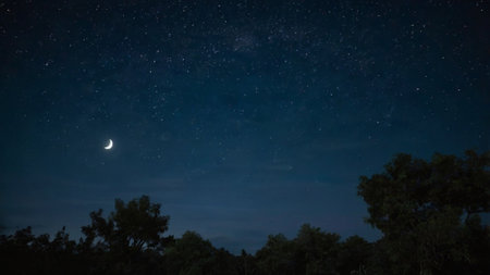 Night sky with stars and milky way. The moon over the forest.
