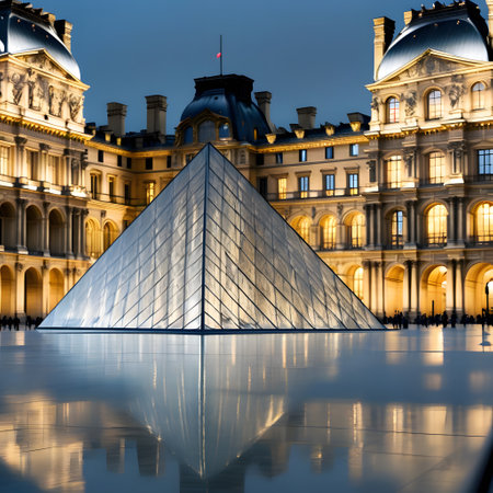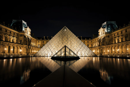 The illuminated architecture of a famous place reflects on water generated by artificial intelligence