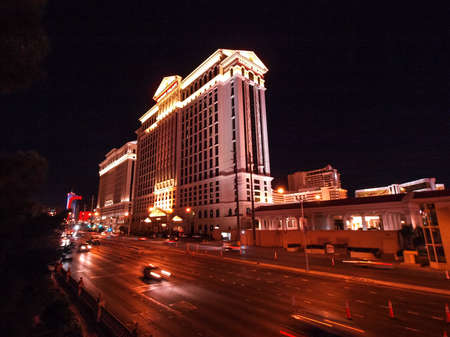 The bustling Las Vegas Strip comes alive at night with colorful neon lights and heavy traffic flowing down the main road, surrounded by iconic hotels and bright billboards.