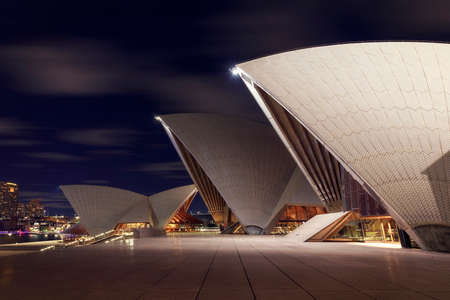 SYDNEY, AUSTRALIA - JUNE 01, 2018: Close up view of the iconic Sydney Opera House at night. It is one of the 20th century's most famous and distinctive buildings.