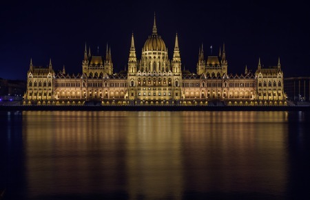 Hungarian Parliament building at night, Budapest, Hungary. Long exposure.