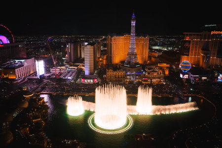 Las Vegas Strip night view featuring iconic Bellagio fountains, Eiffel Tower replica, neon signs, and vibrant lights, capturing city's lively urban energy.