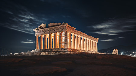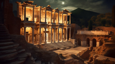Generative AI : Celsus Library in Ephesus with full moon at night Kusadasi Turkey Elements of this image furnished by NASA