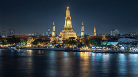 Stunning night view of Wat Arun Temple in Bangkok, showcasing its intricate architecture and vibrant lights reflecting on the river, embodying cultural richness.