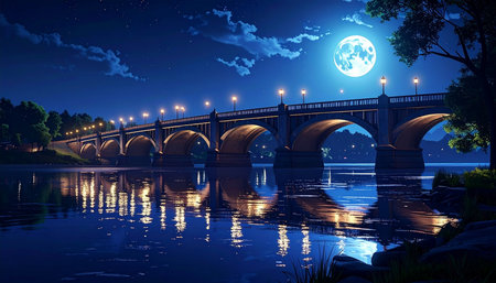 A picturesque bridge over a river at night, with city lights reflecting off the water and the bridge structure illuminated against a dark, starry sky.