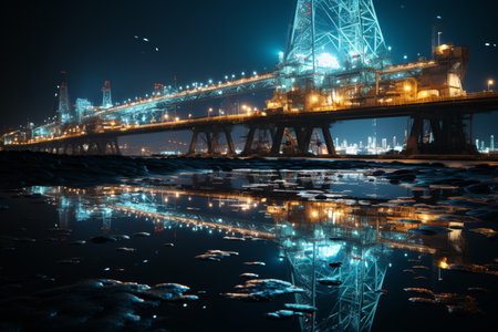 Night view of the bridge illuminated with bright lights. Generative AI illustration