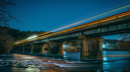 An abstract shot of a bridge over a river with playful car light trails creating a dazzling effect blending seamlessly with the blurred reflections on the waters surface