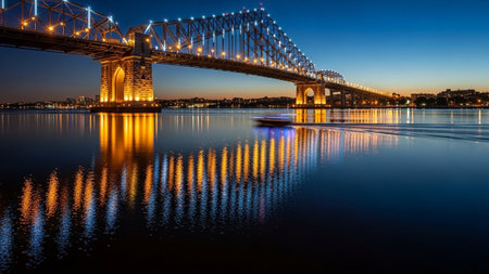 A long-exposure photograph showcases a large bridge at night, highlighted by vibrant lights. The image displays a symmetrical composition, with the bridge and cityscape reflecting in the calm water. The scene presents a dark background with an urban setting, suitable for various editorial and commercial applications.