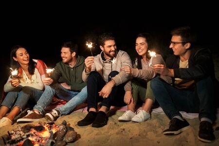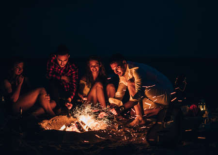 Its the simple things in life that matter. Shot of a group of cheerful young friends having fun with sparklers together outside at night.