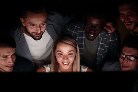 Group of friends going out in the evening and having party. Young people meeting outdoors in the weekend and celebrating together with colored cocktails. Front flash photo style.
