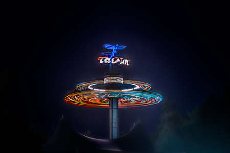 Kouvola, Finland - 28 August 2021: Rotating ride Taifun in amusement park Tykkimaki at night