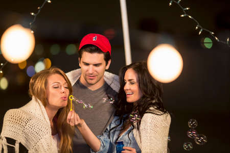 Happy young friends laughing and having fun in a outdoors party. Friendship and celebrations concept.