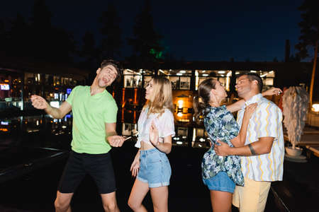 Hectic nightlife. Friendship never sleeps. Run and movement, youth leisure time, blurred background.