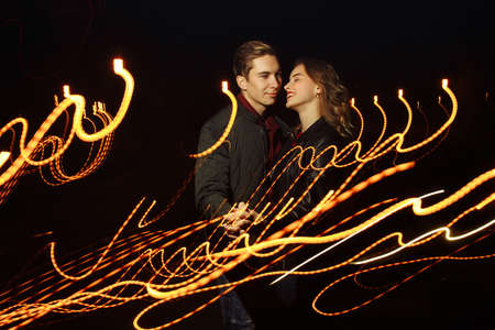 black background, couple dancing, kissing in the lights of light, dance of light, music of light, holiday.light splashes, lines