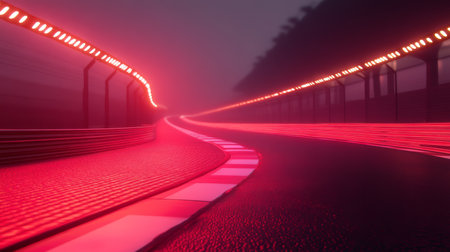 Experience the thrilling spectacle of a racing circuit lit by striking red lights, featuring a winding track in a captivating, misty atmosphere, perfect for motorsport fans seeking excitement
