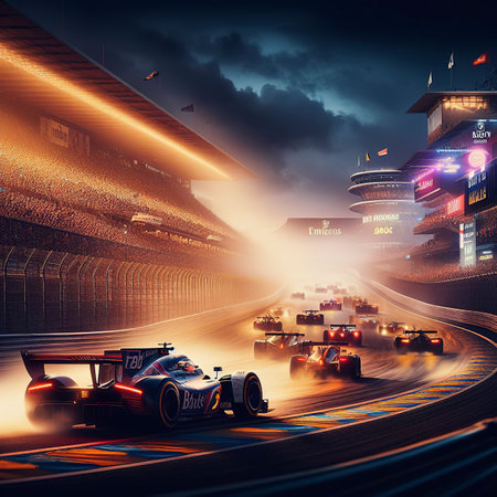 A stunning night scene of the Le Mans track captures the dynamic glow of racing cars under dramatic clouds, showcasing speed and excitement in motorsport.