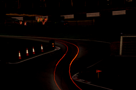 A night racetrack scene where light and shadow create a surreal, cinematic mood