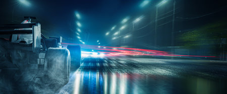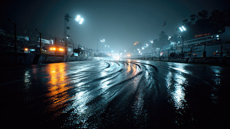 A captivating nighttime scene of a race track covered in rain, showcasing vibrant lights and reflections on the wet asphalt. Perfect for sports themes.