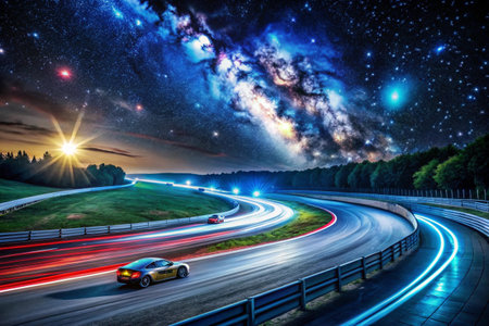This stunning image captures the essence of a racing track at night, showcasing dynamic light trails from speeding cars along a sleek, curving surface.