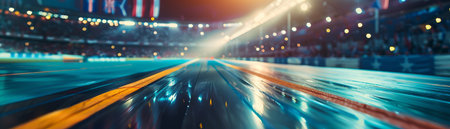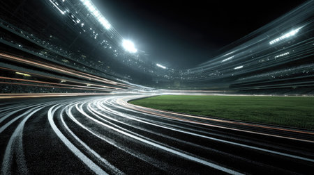 A captivating nighttime image of a running track, featuring light trails that convey speed and motion, embodying a dynamic atmosphere of athletic performance.