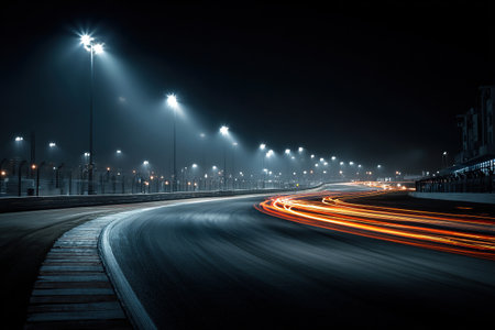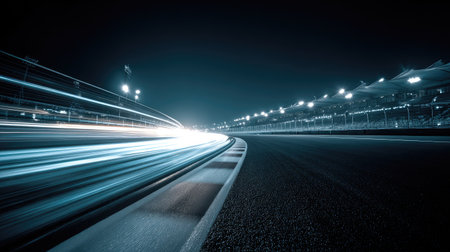 This stunning nighttime image captures a race track illuminated by bright lights, showcasing dynamic motion through blurred streaks of light.