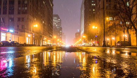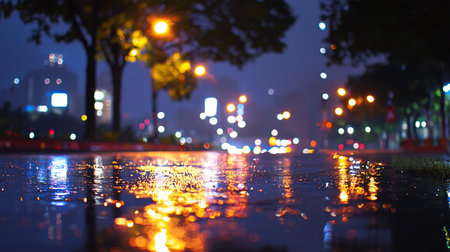 Low-angle shot of a city street after rain, featuring blurred city lights reflecting on the wet pavement, creating a bokeh effect and a moody, atmospheric scene.