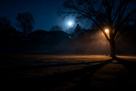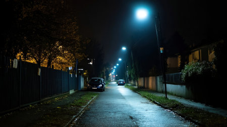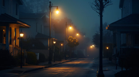 A calm suburban street at night, featuring glowing street lamps casting warm light on quiet homes and trees, creating a serene and tranquil atmosphere for relaxation.
