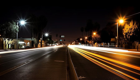 Low angle street view at night with long light trails long exposure created with generative AI technology