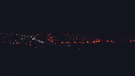 Night Starry Sky With Glowing Stars Above Countryside Town Landscape. Rural Field Meadow In Early Spring. Bright Glow Of Stars. Illumination Lights Of Small Town Or Village.